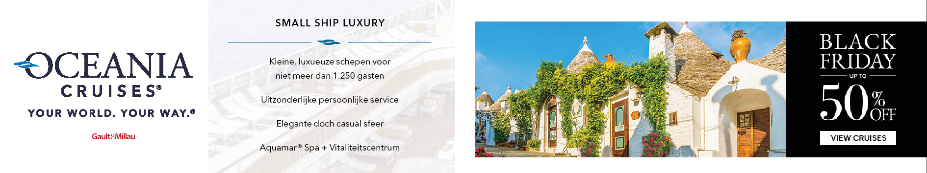 - 18 maart 2026: Western Caribbean Escape, Heen/terug van Tampa, 7 dagen aan boord van Oceania Insignia. Deluxe Outside: € 1.536 ipv. € 3.559. Veranda Stateroom: € 2.004 ipv. € 4.339 – Concierge Veranda: € 2.058 ipv. € 4.429. + Your World Included™ voordelen!*